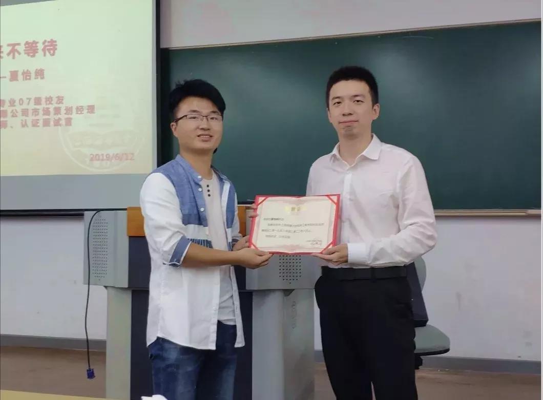 讲座开始前,李万秀老师对夏怡纯校友返校为学生开展讲座表示欢迎,并为他颁发创新创业导师聘书,赠送学校纪念品。