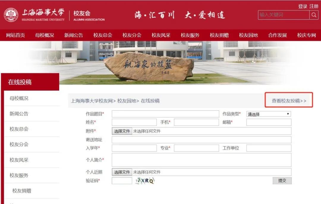 1.在线投稿 (上海海事大学校友会官网—>校友园地—>在线投稿)http://alumni.shmtu.edu.cn/site/shmtu/xyh_new/manuscript/
