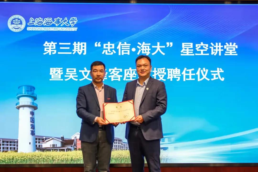10月23日下午,第三期“忠信·海大”星空讲堂暨吴文峰客座教授聘任仪式在学校举行。校党委副书记、副校长李志鹏,学校1995级船舶驾驶专业校友、上海远洋运输有限公司海务主管、高级船长吴文峰,学校校长办公室、校友联络处、商船学院等相关负责人及100余名在校学生出席,活动由商船学院院长张秋荣主持。