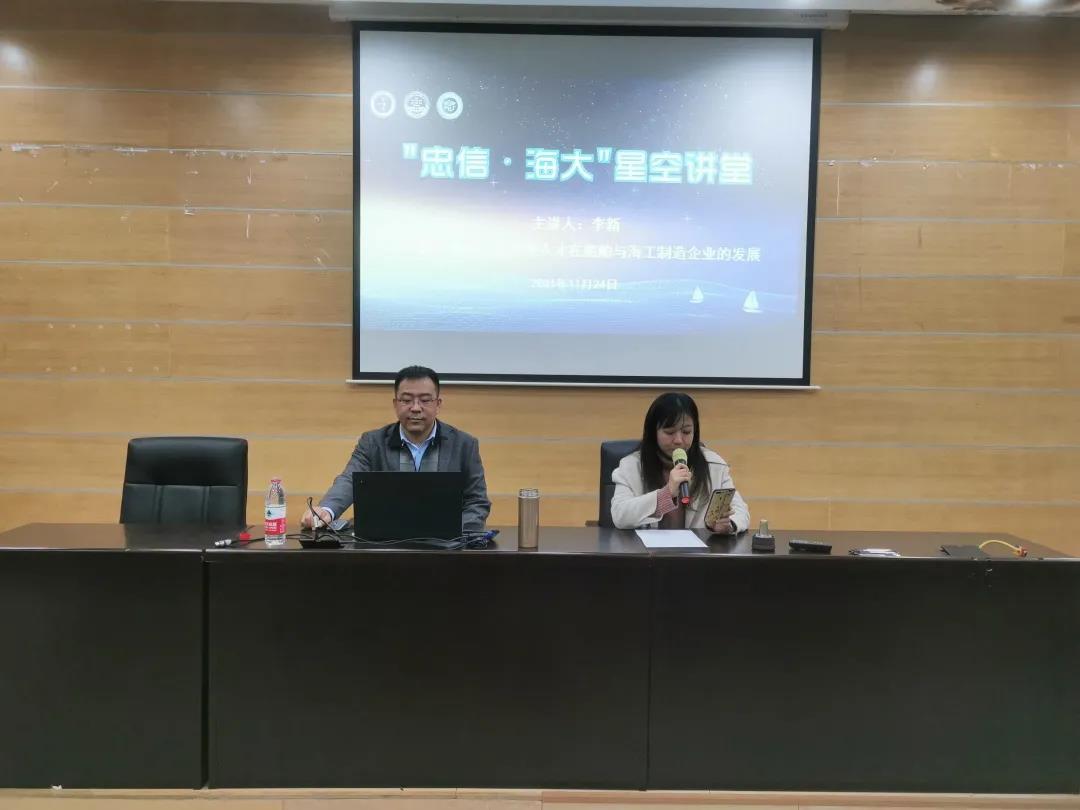 11月24日下午,第五期“忠信·海大”星空讲堂在学校举行。2007级项目管理工程硕士专业校友、中远海运重工有限公司生产与运营部总监、高级工程师李新,校长办公室(校友联络处)、海洋科学与工程学院相关负责人及50余名师生出席。讲座由学院办公室主任潘怡老师主持。